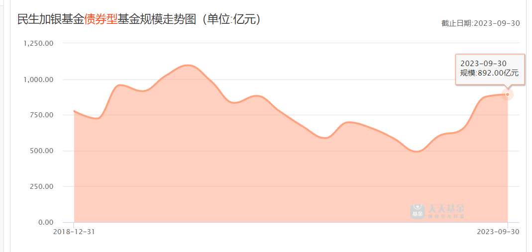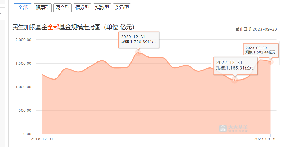 数据显示,2020年底,民生加银基金资管最高达1720.89亿,2022年底仅剩1165.31亿,今年以来快速反弹,9月底回到1502.44亿。细分数据显示,主要是债券与货币基金规模大幅反弹促成,其中债券型基金当年增长近300亿元。