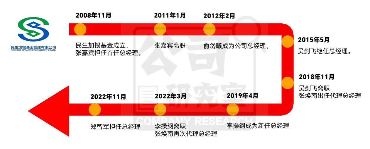 公开信息显示,从公司成立以来,民生加银基金总经理变动比较频繁,差不多每3年就换人。2018年—2022年,4年间,换了3任总经理,现任董事长张焕南曾两度代理公司这一关键职务。