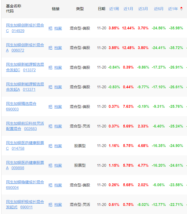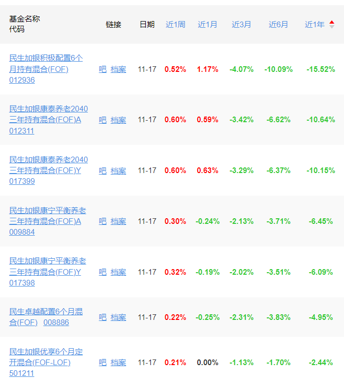 公司研究室注意到,近一年跌幅最大的民生加银积极配置6个月持有混合(FOF),中短期业绩都不行,从业绩排名看,今年以来及近一年,这只基金都在同行中垫底。