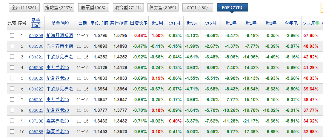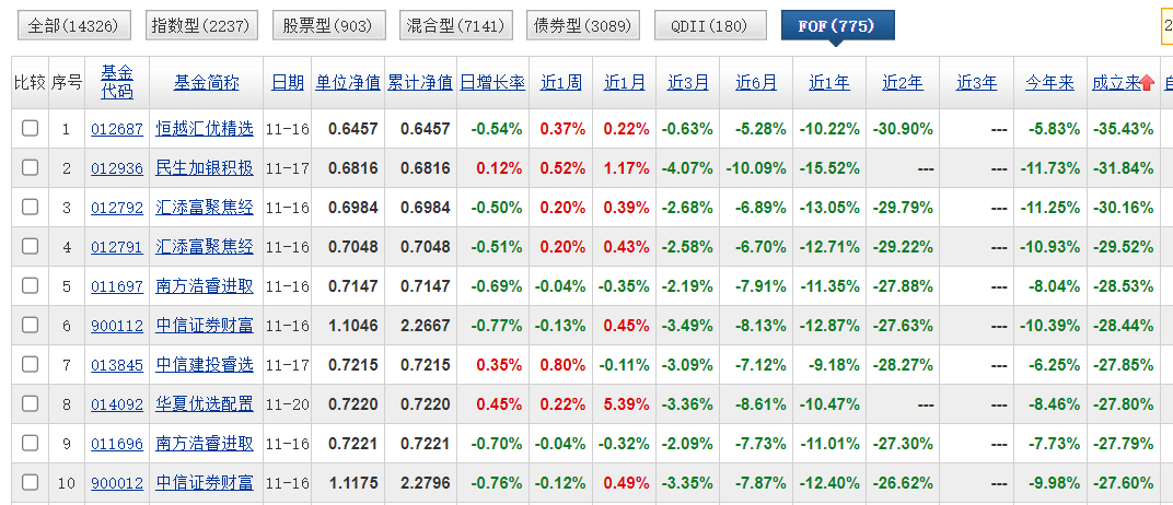 从天天基金网数据看,现存775只FOF基金,自成立以来业绩前十中,表现最好的是成立于2018年5月的前海开源裕源(FOF),截至2023年11月17日,五年来累计上涨57.95%;表现最差的是成立于2021年7月的恒越汇优精选三个月混合(FOF),截至2023年11月16日,累计下跌35.43%。
