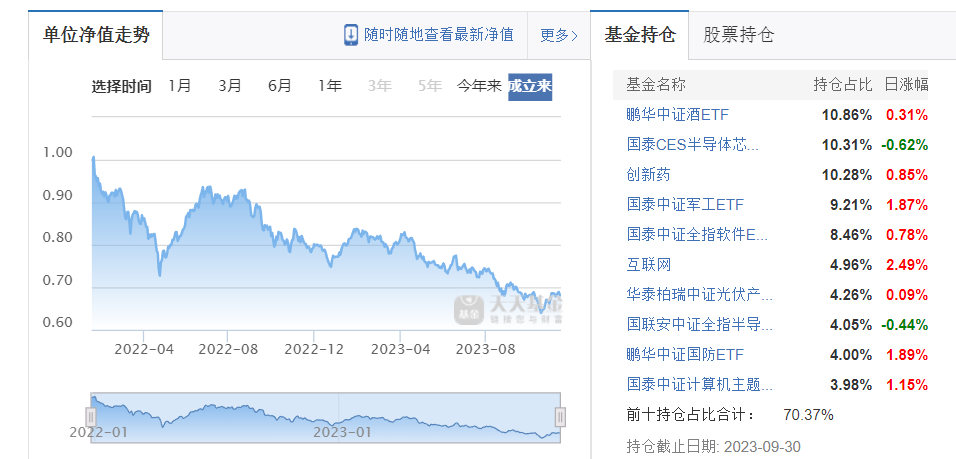 业内人士分析,首先,其成立于2021年12月,正是大盘高位震荡后暴跌的前夕,因此,这只基金成立时间不讨巧,选时上就输掉一筹;其次,从其持仓前十组合看,有4只国泰基金,2只鹏华基金,1只富国基金,1只银华基金,1只华泰柏瑞基金,1只国联安产品,就是没有民生加银基金自己的产品。