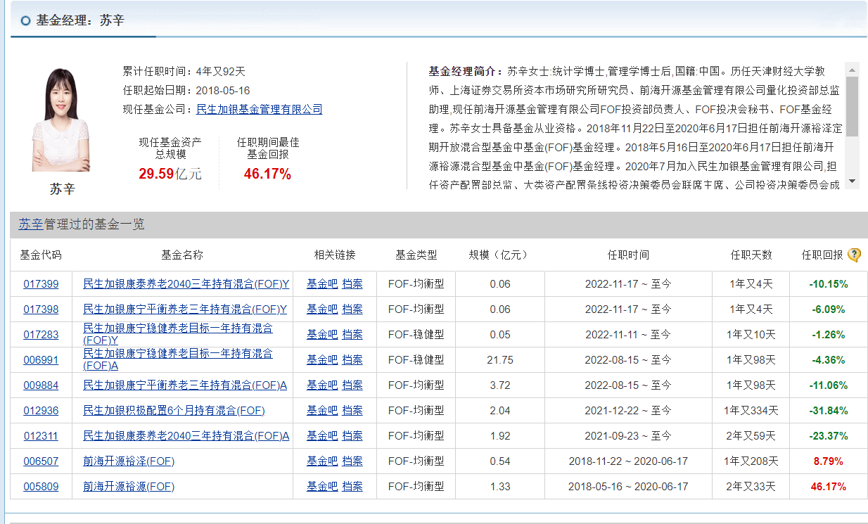 公开信息显示,苏辛是2020年7月从前海开源基金公司跳槽到民生加银基金的,来之前,她是前海开源基金公司FOF投资部负责人,目前业绩排名第一的前海开源裕源(FOF),正是在她手里发行上市,离职时任职回报46.17%。