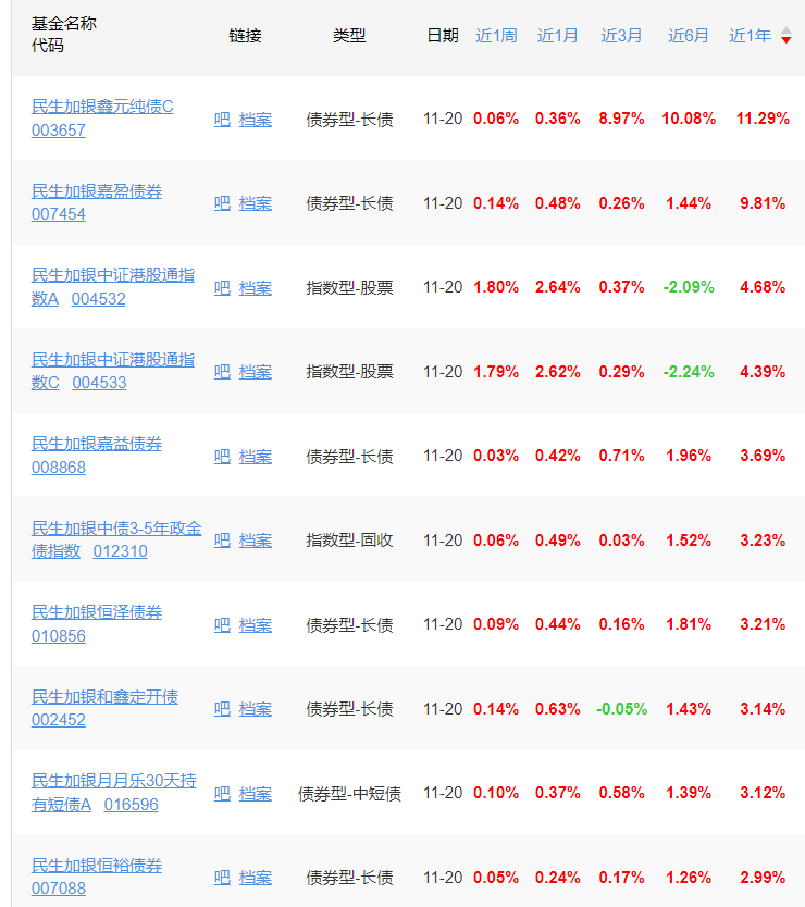 由于大盘弱势震荡,近一年,民生加银基金旗下产品的业绩也是绿肥红瘦。从天天基金网数据看,截至11月20日,公司旗下业绩上涨前十产品中,有8只是债券型基金,2只港股通指数基金,最大涨幅11.29%,最小涨幅2.99%。