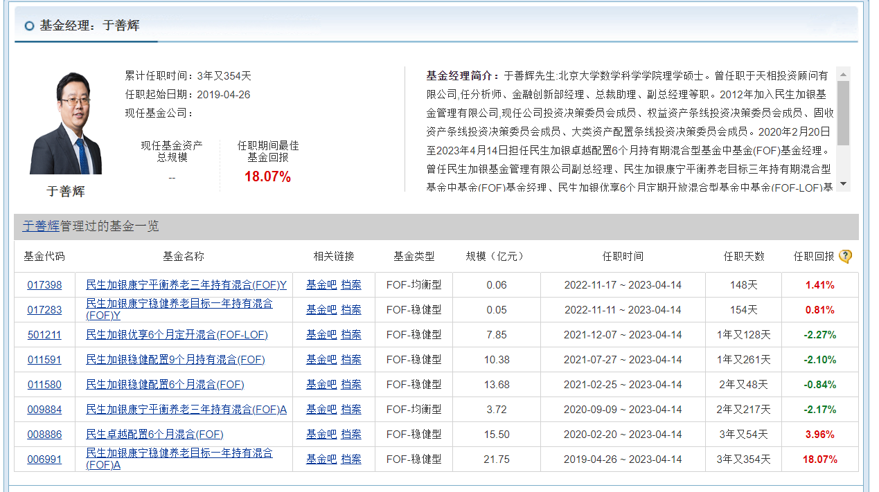 4月份,担任民生加银基金副总经理、基金经理、公司投资决策委员会成员的于善辉离职。2021年民生加银基金FOF规模达200亿元高点时,旗下所有产品均归于善辉管理,当时他在管的产品,占全市场FOF基金规模15%以上。