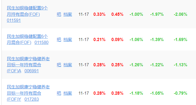 不过,与其他细分品类相比,民生加银的FOF基金,近一年则是全线亏损,11只产品无一翻红。截至11月17日,近一年跌幅最大的是民生加银积极配置6个月持有混合(FOF),下跌15.52%,跌幅最小的是民生加银康宁稳健养老目标一年持有混合(FOF)Y,下跌0.79%。