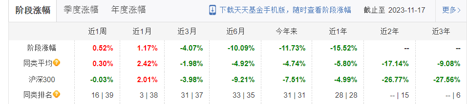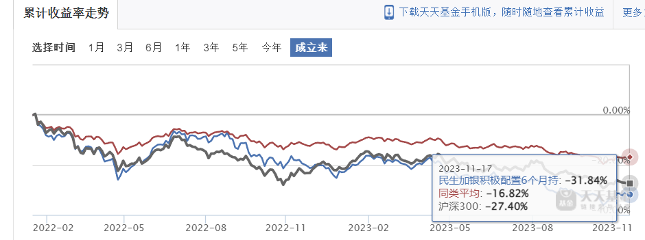 业绩第二差的就是成立于2021年12月的民生加银积极配置6个月持有混合(FOF),截至2023年11月17日,其净值累计下跌31.84%。