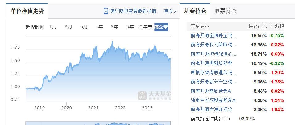 业内人士分析,它不仅吃到了2019.1-2021.2那波大盘上涨红利,其投资组合前九中,前海开源自家基金占了7只,占比高达78.94%。从这只FOF单位净值走势图看,近2年大盘走势不好 ,但其净值却能保持在相对高位震荡。