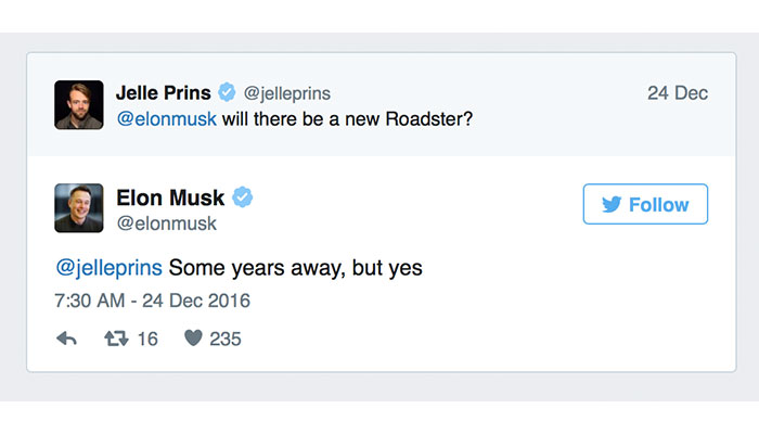 一名粉丝在社交媒体上问马斯克,传闻中的第二代Roadster是否真的会来临。后者回复称,“需要几年时间,但一定会”。虽然马斯克的此类暗示难以带来多大的震撼效果,但他的回复却清晰表明,特斯拉的确有计划对Roadster进行更新。当然,Model S、Model X和Model 3等车型的优先级显然更高。