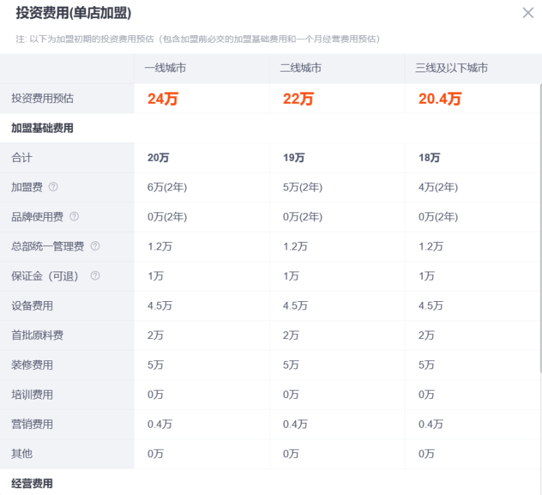 经过咨询,根据地区,喜姐的加盟费分为3.98万、4.98万、5.98万三个档次,每年1.2万元的管理费、1万元保证金、2.5万左右的核心设备和2-3元的首批物料。