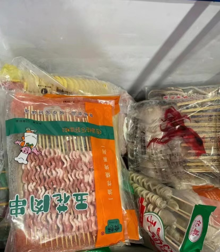 食材占日常经营成本的大头,培根、五花肉等肉类半成品刘阿姨是去当地批发店按袋数进货,折算下来,成本一块钱一根,蔬菜大部分是刘阿姨和丈夫一起开着三轮车去乡下收。