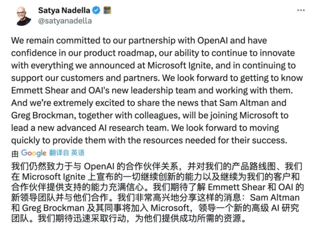 当外界都在关心阿尔特曼何去何从时,更戏剧化的一幕出现了。微软CEO纳德拉在社交平台上宣布,OpenAI创始人阿尔特曼和Brockman及其同事将加入微软。随后,阿尔特曼转发了表示,“任务仍在继续”。