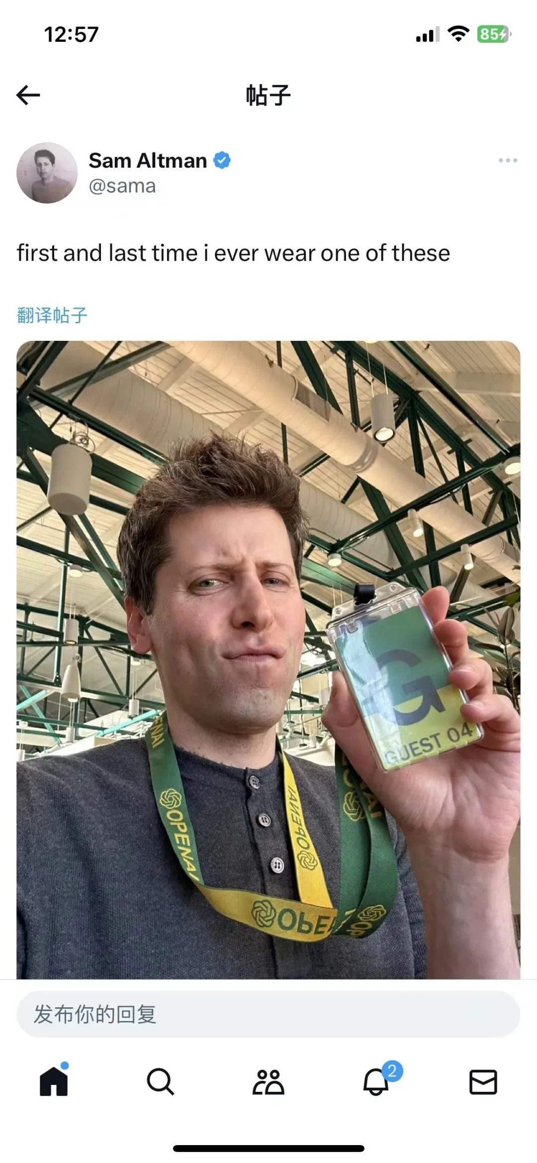 当地时间11月20日,阿尔特曼在Twitter发文,“这是我第一次也是最后一次戴这个”,图片中的他身在OpenAI旧金山总部,佩戴着访客工牌。