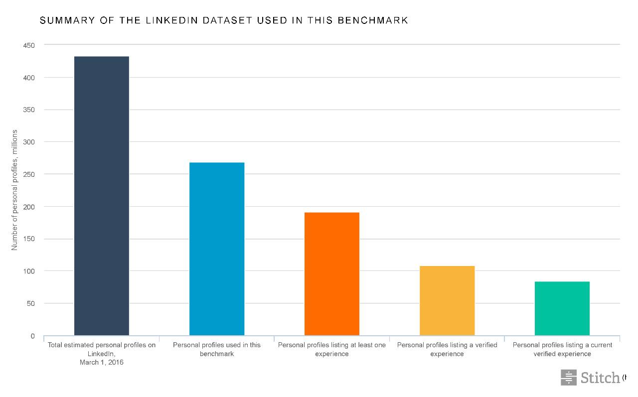 ▲ 截止 2016 年 3 月 1 日,Linkedin 上的个人档案大约 4.3 亿,此次参考了 2.6 亿例档案,其中列有至少一项经历的近 1.9 亿, 有一项已认证经历的超过 1 亿,当前经历已认证的近 8000 多万。