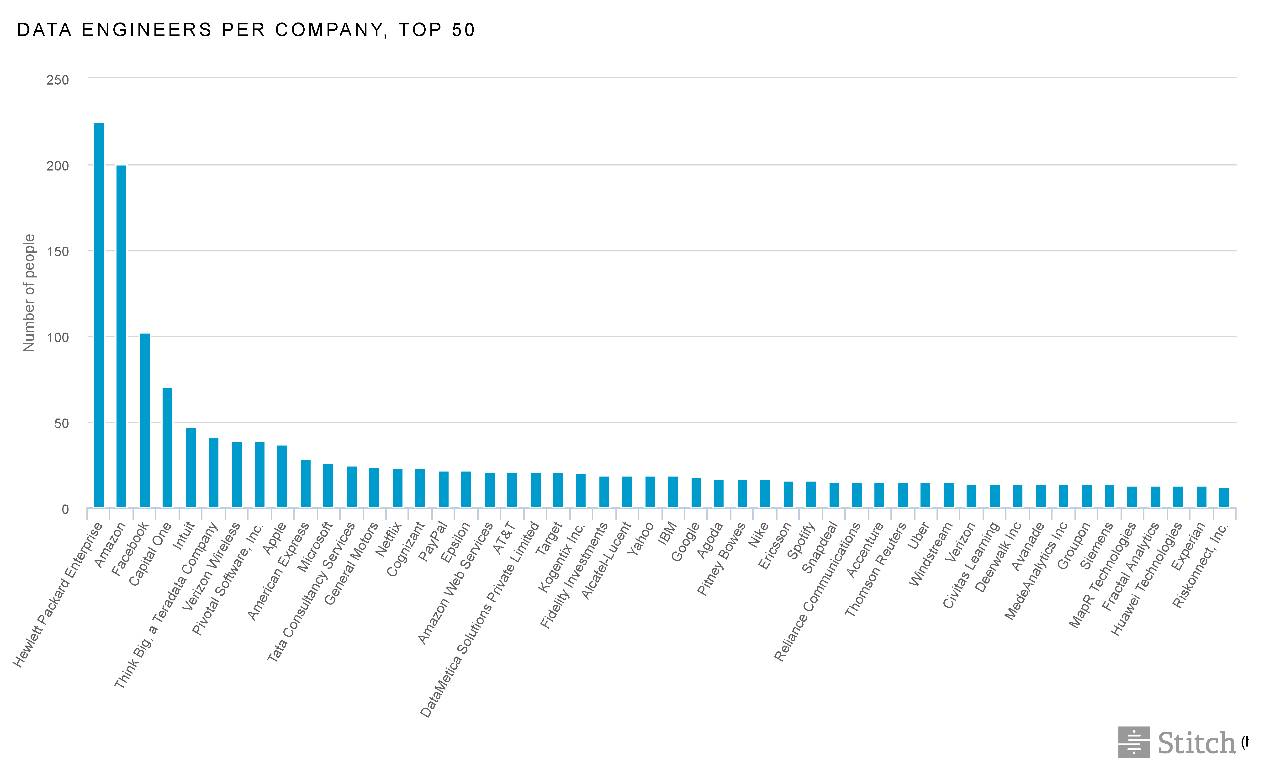 当我们看到聘用了数据工程师的具体公司时,他们在科技领域的受欢迎程度就更加明显了。在前十的公司里,只有两家公司不是专门从事技术或数据的:一家电信公司(Verizon)和一家金融机构(Capital One)。