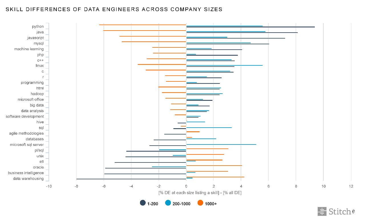 真实情况是,在规模更大的公司,数据工程师更在意 “企业级” 相关的技能,比如 ETL(Extract-Transform-Load)、BI(Business Intelligence:商业智能)、数据仓库等,而在较小的公司,数据工程师更多的把心力花在 Python、Java 等编程语言上(编者按:Python 和 Java 作为普通的编程语言,可以用来构建产品,这对于小公司来说属于核心业务。)