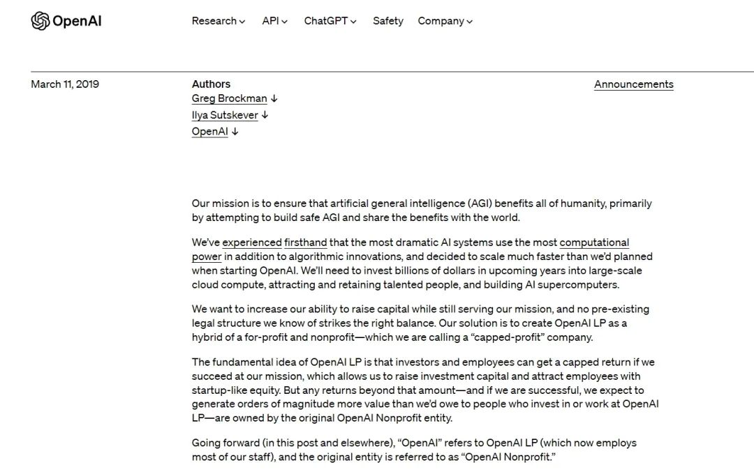 图:2019年3月11日,OpenAI 宣布创建营利性实体的公告