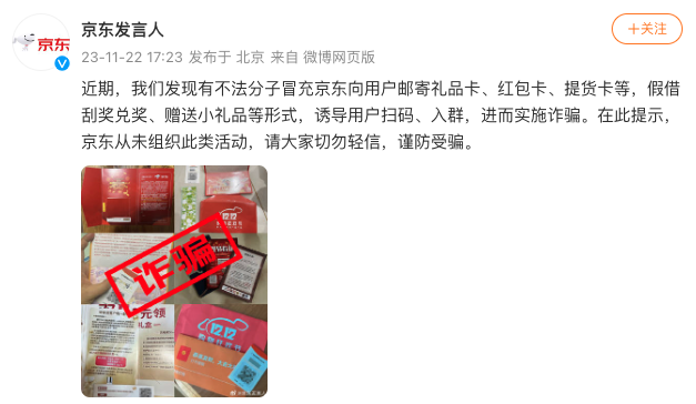 11月22日,@京东发言人 发文称:近期,我们发现有不法分子冒充京东向用户邮寄礼品卡、红包卡、提货卡等,假借刮奖兑奖、赠送小礼品等形式,诱导用户扫码、入群,进而实施诈骗。在此提示,京东从未组织此类活动,请大家切勿轻信,谨防受骗。