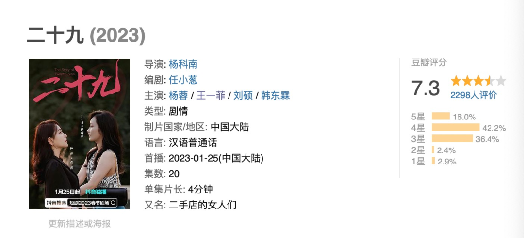所以,长短视频这些年都在不断加强对短剧的内容监管,积极引入老牌传统影视公司入局短剧,试图把短剧做成一个“长生意”。今年抖音的霸榜短剧《二十九》,就是由柠萌影业出品、杨蓉主演,豆瓣评分高达7.3。它表面上是个抓出轨打小三的故事,实际上是个“girls help girls”的故事。很显然,这就是平台现在推崇的高质量短剧榜样。