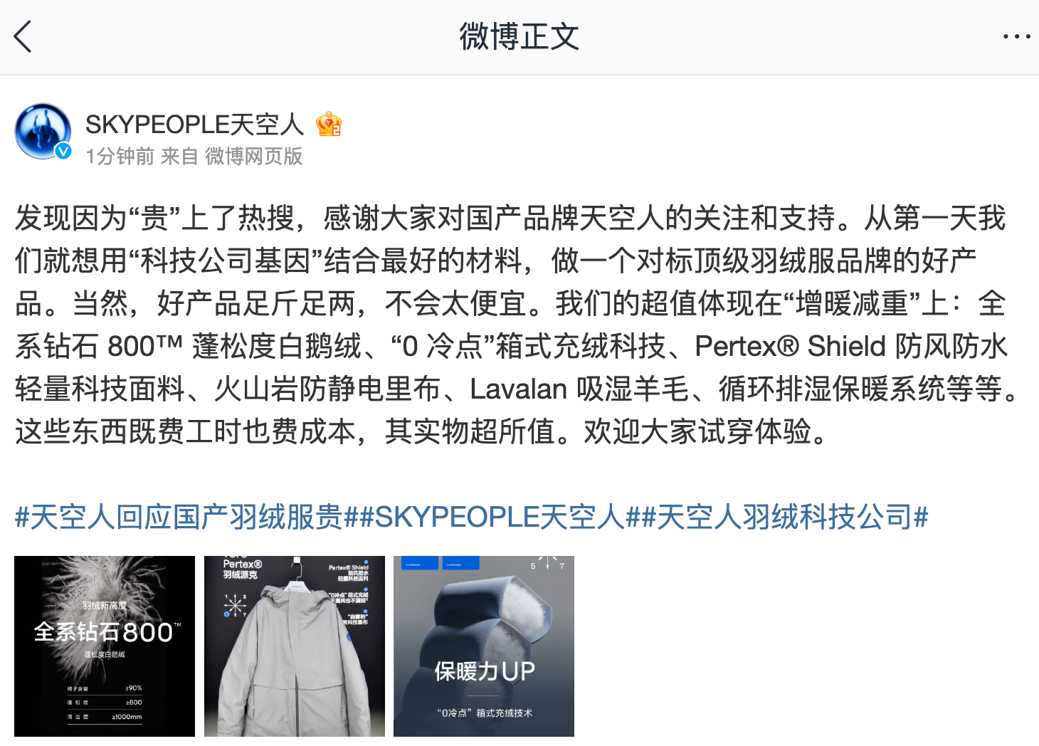 SKYPEOPLE天空人在官方微博中,具体表示,“发现因为贵,上了热搜,感谢大家对国产品牌天空人的关注和支持。从第一天我们就想用 科技公司基因,结合最好的材料,做一个对标顶级羽绒服品牌的好产品。当然,好产品足斤足两,不会太便宜。”