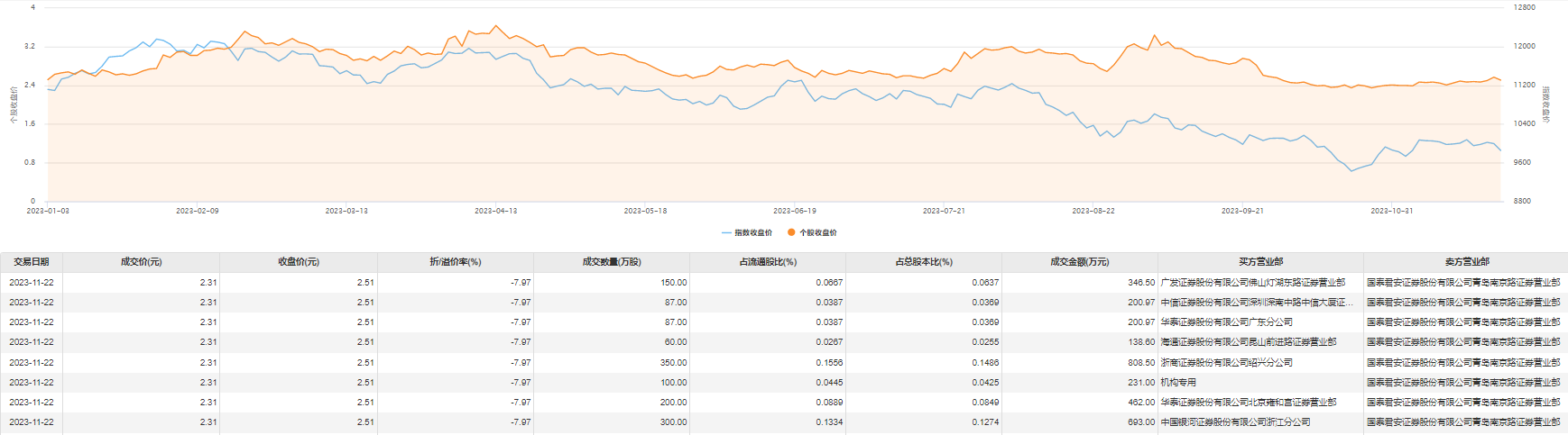11月22日,我爱我家今日大宗交易成交1334万股,成交额3081.54万元,占当日总成交额的12.49%,成交价2.31元,较市场收盘价折价7.97%。