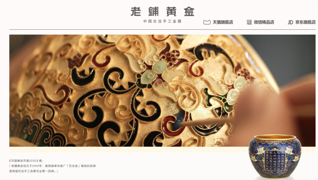 老铺黄金成立于2016年,是国内率先推广古法黄金珠宝概念的品牌,并最早从事传统工艺黄金珠宝的品牌化运营。公司的黄金产品主要包括足金黄金产品、足金镶嵌产品(足金镶嵌钻石或其他宝石)。