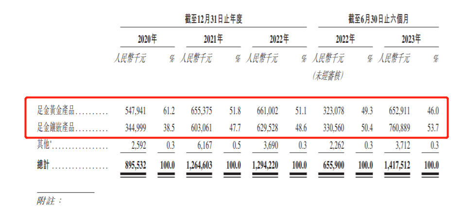 值得注意的是,老铺黄金的主要收入来自足金黄金产品和足金镶嵌产品。其中,报告期内,足金黄金产品收入分别为5.48亿元、6.55亿元、6.61亿元和6.53亿元;足金镶嵌产品收入分别为3.45亿元、6.03亿元、6.3亿元和7.61亿元。2023年上半年,足金镶嵌产品收入大涨,为老铺黄金贡献超一半收入。