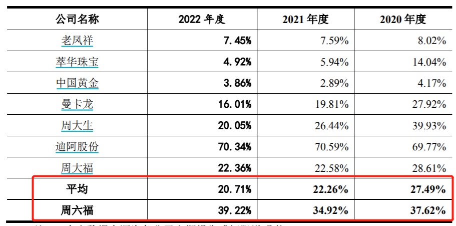 此外,2023年6月29日,老铺黄金的同行公司周六福在深交所主板更新了招股书。招股书显示,2020年-2022年,周六福的毛利率分别37.62%、34.92%和39.22%,相比周六福,老铺黄金的毛利率也处在较高的水平。