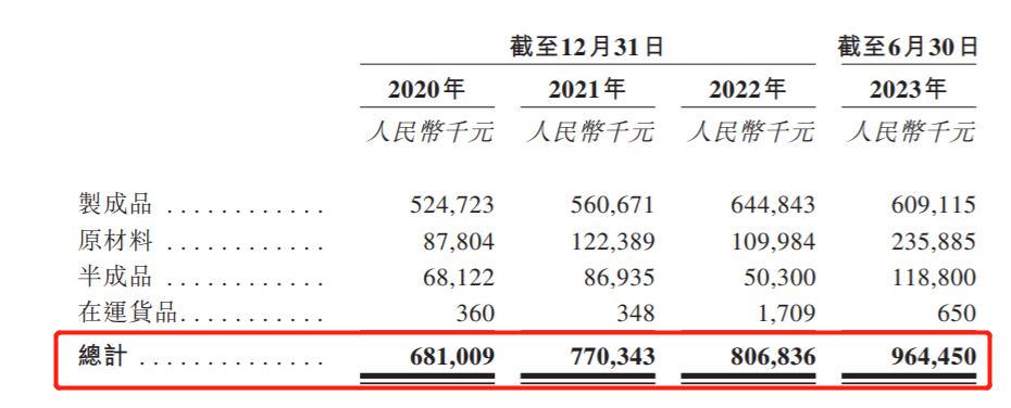 公司存货由制成品、原材料、半成品和在运货品组成,其中制成品为存货的“大头”。报告期内,制成品金额分别为5.25亿元、5.61亿元、6.45亿元和6.09亿元,2020年-2022年呈连年增长趋势。