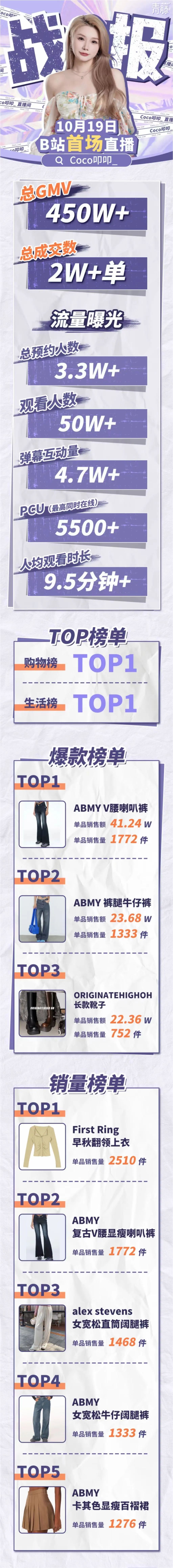 首场直播便取得总GMV超450W+成绩的B站穿搭UP主@Coco叩叩_(以下简称“Coco”),霸榜当晚购物榜、生活榜第一,是青藤文化在B站直播带货领域成功打响的第一枪。
