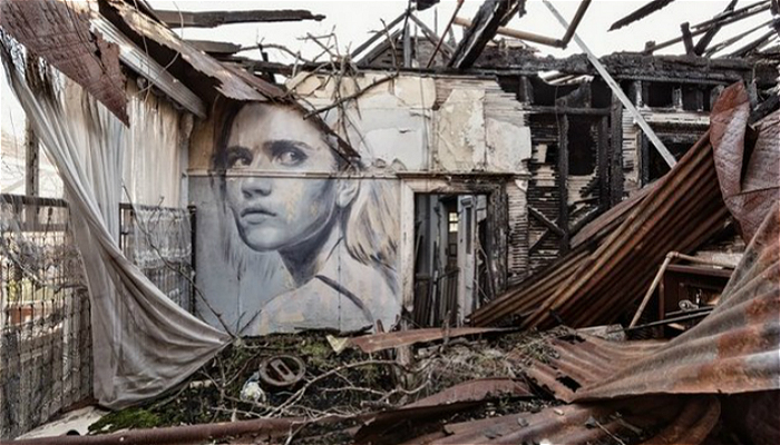 Rone的壁画作品《Homewrecker》:一个女人在遭受火灾的房屋废墟中仰望着。它是“Empty”画展的作品之一。