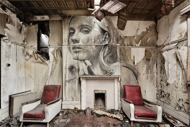 在街上闲逛时看到的艺术作品,很少有能被放在美术馆里的。墨尔本艺术家Rone从最开始就并没有将自己独特的、具有英雄色彩的女性画像画在画板上,而是画在了自己家乡废弃的建筑物或其他出人意料的表面上。经过十多年的努力,Rone现在已经名震全球,他的作品还在澳大利亚国家美术馆里展览。而且,他作品巡回展的城市从伦敦一直到圣弗朗西斯科(以及中间的每一个地方)。他最具吸引力的作品就是美丽与腐朽的融合,他将惊人的肖像画画在被大自然和时间所摧残过的地方。他10月份的画展“Empty”就在墨尔本具有历史意义的菲茨罗伊建筑中举行,它们在接下来的几周内就将会被拆掉。Rone完完全全地抱住了转瞬即逝的美的本质,他希望自己的每一幅作品中,人类和自然元素都能相互穿插、融合。让我们来浏览一下他的作品——那些与大自然以及他们所栖息的城市融合的作品。