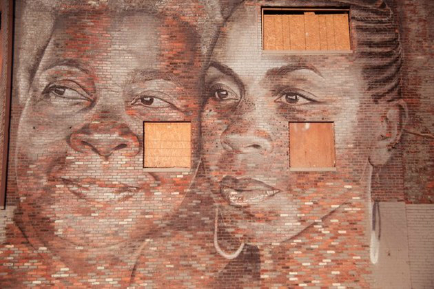 一名女子以及她的母亲,画于底特律的一面墙上。