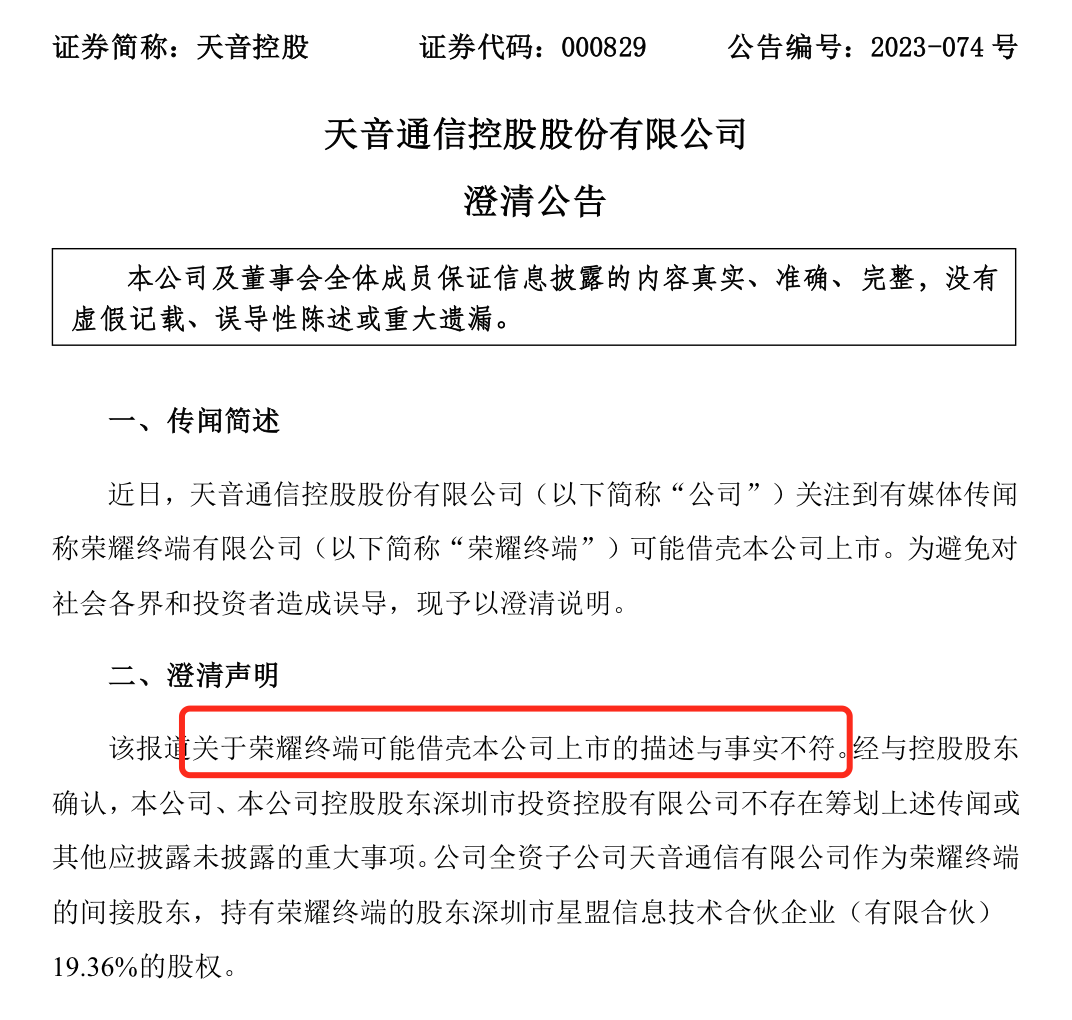 据天音控股的澄清公告,公司关注到有媒体传闻称荣耀终端有限公司(以下简称“荣耀终端”)可能借壳公司上市,特此澄清声明,该报道关于荣耀终端可能借壳公司上市的描述与事实不符,经与控股股东确认,公司、公司控股股东深圳市投资控股有限公司不存在筹划上述传闻或其他应披露未披露的重大事项。