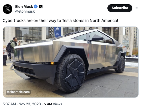 11月23日,特斯拉CEO埃隆·马斯克在社交平台X透露,Cybertruck电动皮卡正在运往北美特斯拉门店的途中。此前马斯克表示,将于11月30日在得州超级工厂举行Cybertruck交付活动。