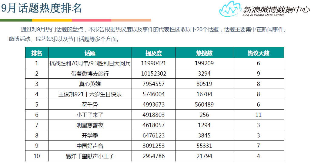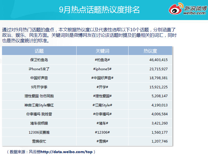而微博也是,在垂直内容上积极发力。2014年后期,微博在内容上不再只专注社会公共事件,而专注个人兴趣,比如旅游、体育、母婴等领域,同时微博重点培训旅游、炒股、美妆、时尚类的网红,这波网红跟直播和短视频的结合让微博迎上了移动视频的风口。有人还特意做了对比,2012年9月,微博热门话题是这样: