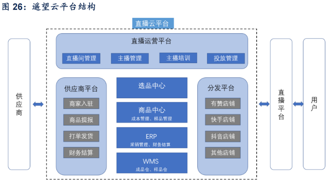 这一整套流程管理和操作模式,均被“遥望云”系统高度整合,包含五大板块,直播云、商家云、工具云、数据云和营销云,完成直播电商闭环体系建设。在直播前排期、货盘、选品等步骤实现了部分或全程系统内进行,直播中实时分析数据提供参考,直播后复盘总结反馈至新一阶段的直播,实现了精细化运营,为公司在直播运营领域构筑了护城河。