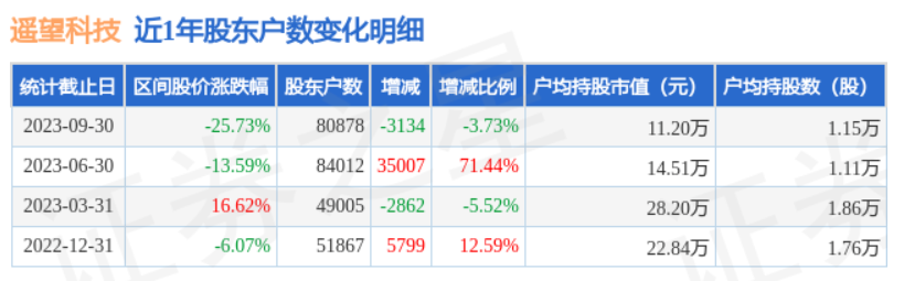 截至2023年9月30日,遥望科技股东户数为8.09万户,较上期(2023年6月30日)减少3134户,减幅为3.73%。遥望科技前5大股东依次为LYONEGROUPPTE.LTD.、谢如栋、云南兆隆企业管理有限公司、香港中央结算有限公司、银河德睿资本管理有限公司,分别持股7.81%、7.36%、6.11%、1.43%、1.23%。