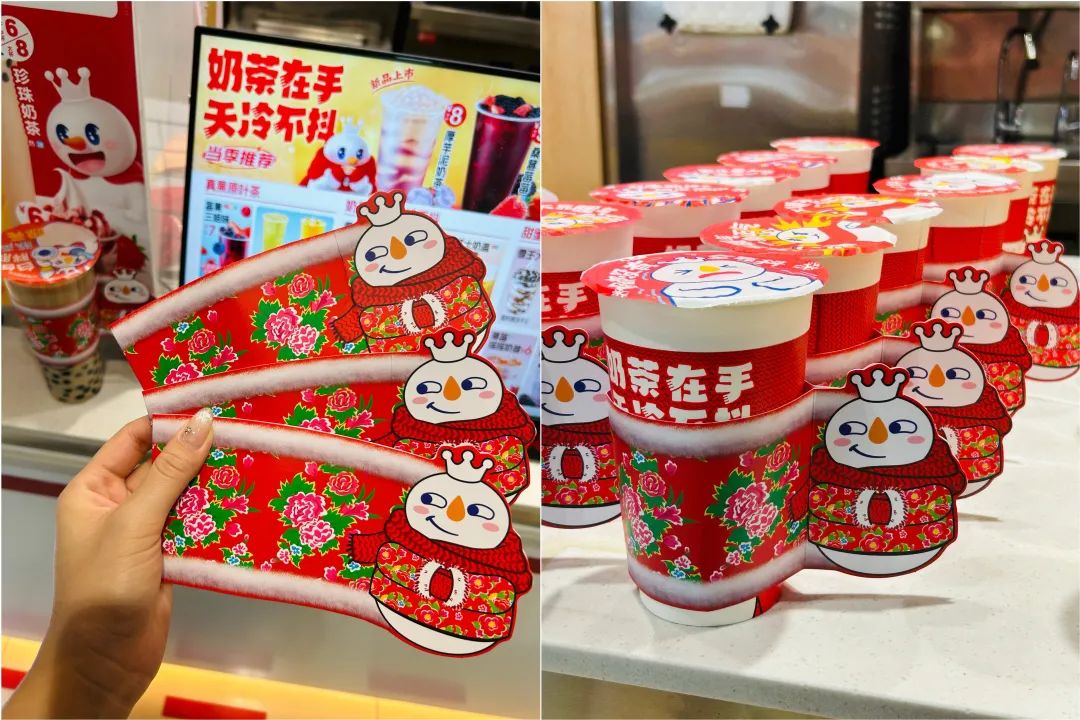 最近,茶饮圈正在上演一场“杯子换装秀”:前有雪王穿上“土潮”的东北特色花棉袄;后有沪上阿姨换上国风马面裙;还有霸王茶姬,立冬一到就戴上了围脖杯套……