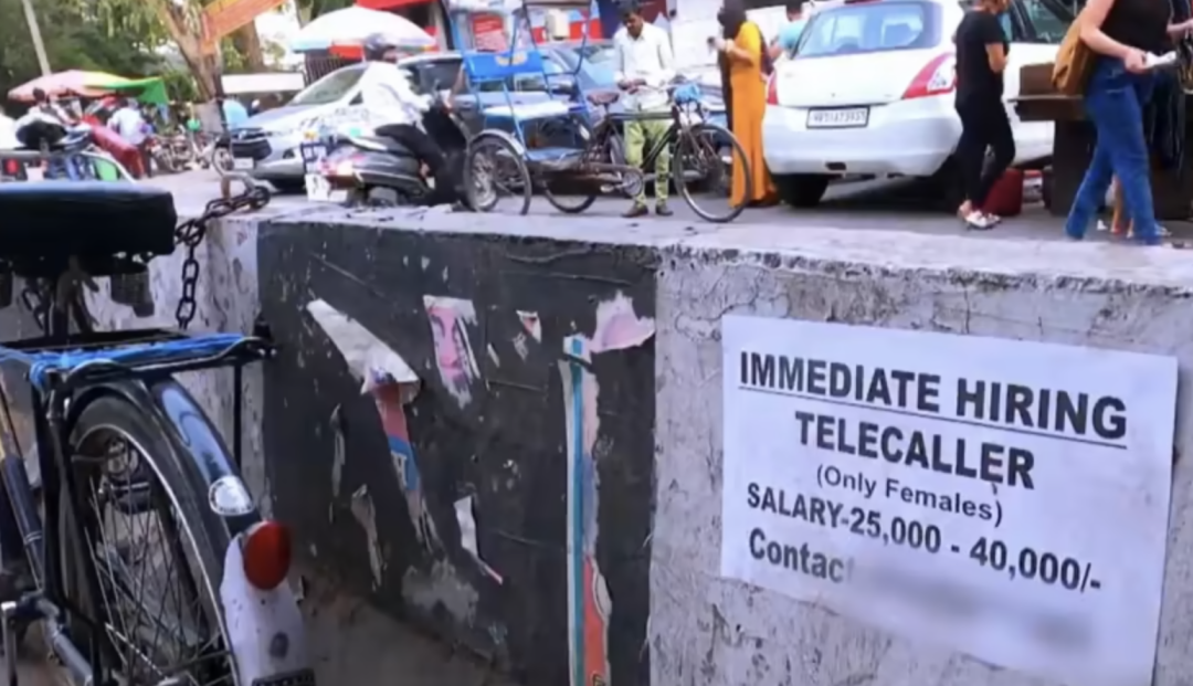 △ 印度街头的招聘广告,写着“急招电话员,仅招聘女性,薪水25000到40000卢比(约合2141-3427元人民币)”。(图源:社交媒体)
