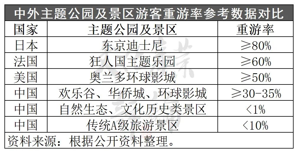 据相关调研数据显示,大多数旅游景区的游客重游率低于10%,很多景区因为重游率太低放弃了指标的统计。而在美国、法国等旅游业发达国家,主题公园及其他旅游景点的重游率均在70%以上。其中,日本东京的迪士尼乐园重游率甚至高达80%以上,居世界前列。这也是近年来主题公园在国内崛起的主要因素。