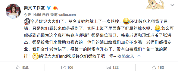 12月29日,秦岚工作室发微博澄清,表示莫名其妙地就上了一次热搜,还让韩兆老师背了黑锅。工作室称秦岚里面裹了好厚的棉衣,怎么可能碰到,都是借位而已。韩兆和张洪杰都是助力嘉宾,他们的演出加分不少。