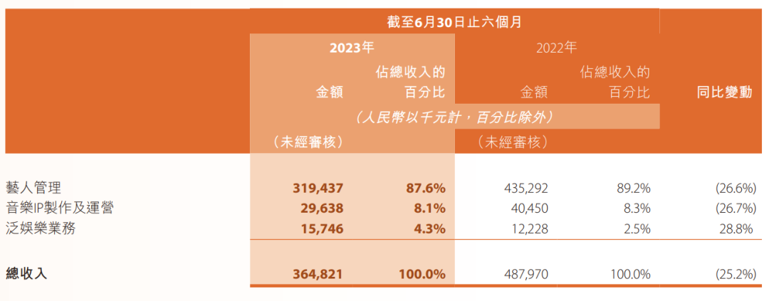 财报显示,在乐华娱乐的收入构成中,艺人管理业务为主要来源,主要来自艺人参演影视剧和电影、综艺节目和公开演出的商业收入,艺人担当商业代言、品牌推广活动和其他商业推广活动的收入。这些收入占到了2023年上半年收入构成的87.56%。
