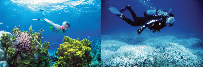 大堡礁的生态也遭到了严重的破坏,左图是2002年的大堡礁,右图拍摄于2014年。