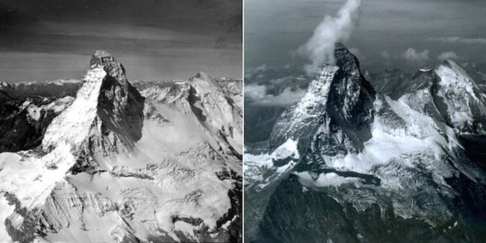 左图为19世纪90年代拍摄的谬尔冰川,右图拍摄于2005年,你可以看到全球变暖让环境产生了多么巨大的变化。