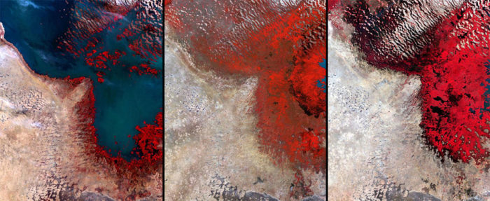 非洲乍得湖,从左到右分别为1972年、1987年和2002年拍摄的卫星图。这个全球第六大湖泊正因为严重的旱灾在慢慢消失。
