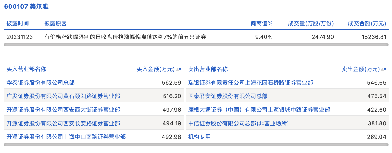 11月23日,美尔雅今日涨停,全天换手率6.87%,成交额1.52亿元,振幅10.38%。龙虎榜数据显示,机构净卖出269.04万元,营业部席位合计净买入737.33万元。上交所公开信息显示,当日该股因日涨幅偏离值达9.40%上榜,机构专用席位净卖出269.04万元。