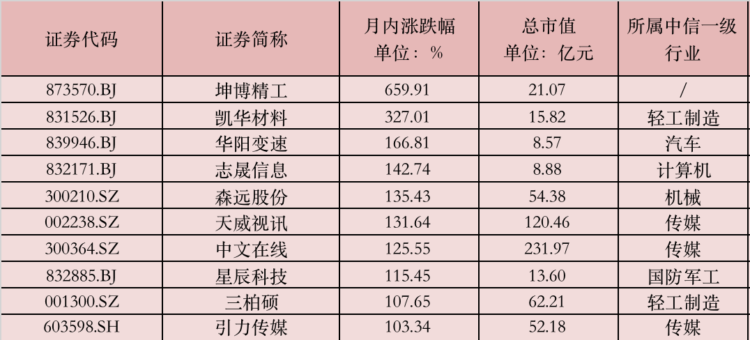 截至11月23日收盘,Wind数据显示, 55只个股月内涨幅超50%,其中,10只个股涨幅超100%。从市值来看,多为中小市值个股。板块方面,以上个股集中于TMT板块。
