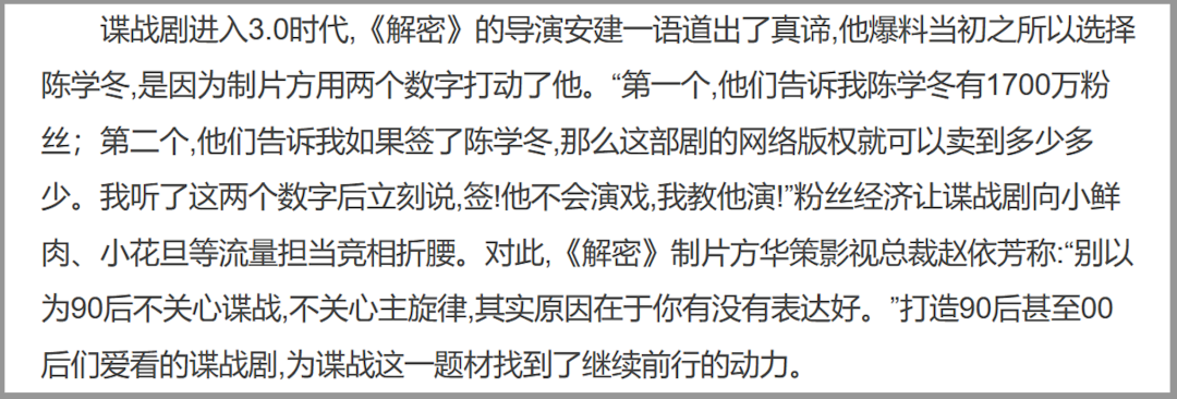 后来是看重流量明星与网生低龄群体的关系,请流量明星能满足当时行业的“媚青”诉求,更容易拉到投资、找到平台并卖出高价;另一方面,也能让谍战、创业、主旋律等传统题材快速吸引年轻人目光,获得热度支持、口碑维护等非传统待遇。