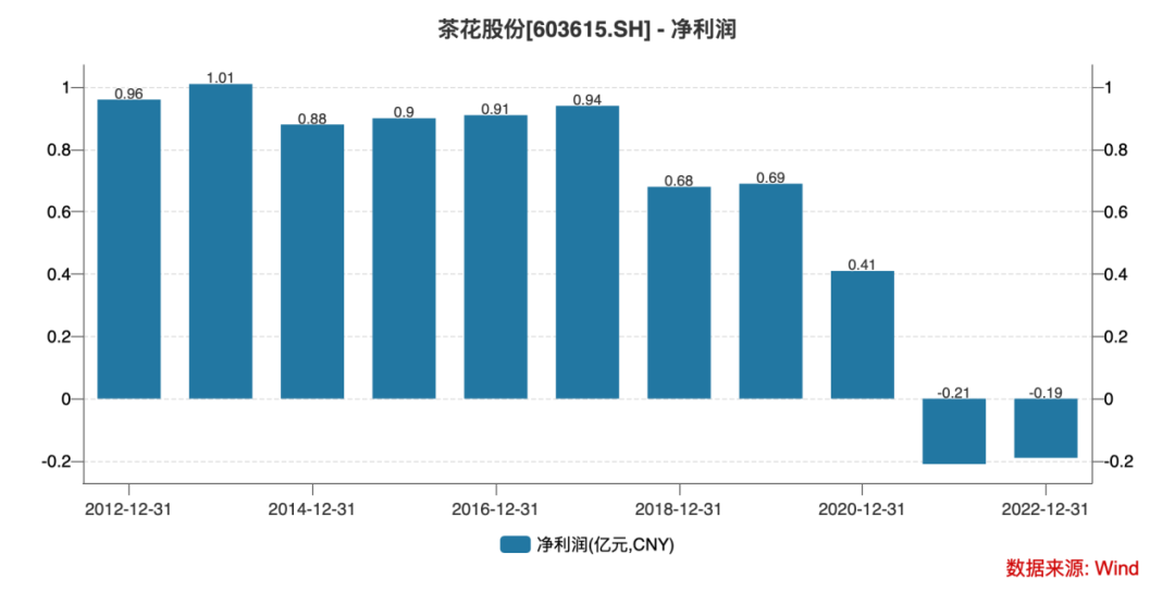 业绩方面,茶花股份上市6年的营收并未稳步增长,还在2020年和2022年出现了下滑。净利润在上市后更是持续波动下滑,2017年-2020年的净利润分别是0.94亿元、0.68亿元、0.69亿元、0.41亿元,2021和2022年还出现亏损,分别净亏损2100万元和1900万元。6年净利润合计2.32亿元。