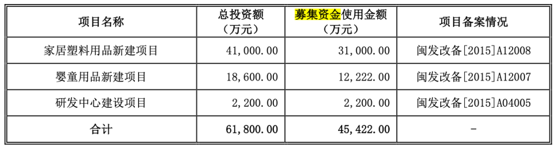 IPO期间,茶花股份提到的募资用途有三个方面,一个是家居塑料用品新建项目,募集资金使用金额3.1亿元;一个是婴童用品新建项目,募集资金使用金额1.22亿元;还有一个是研发中心建设项目,募集资金使用金额2200万元。